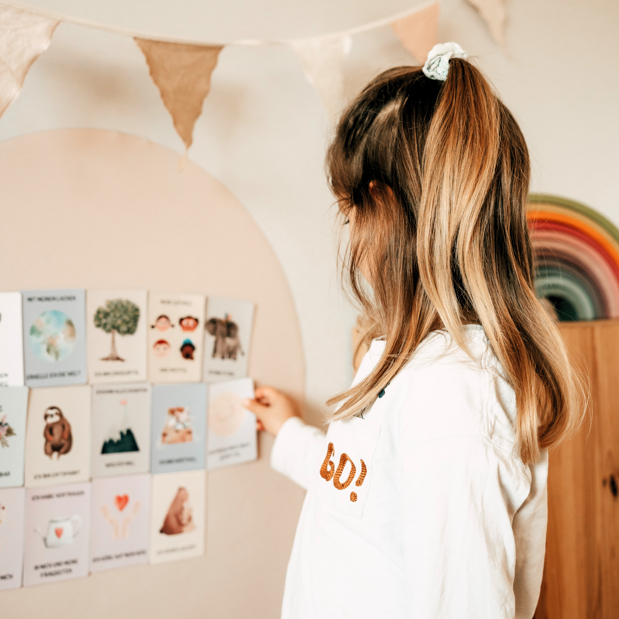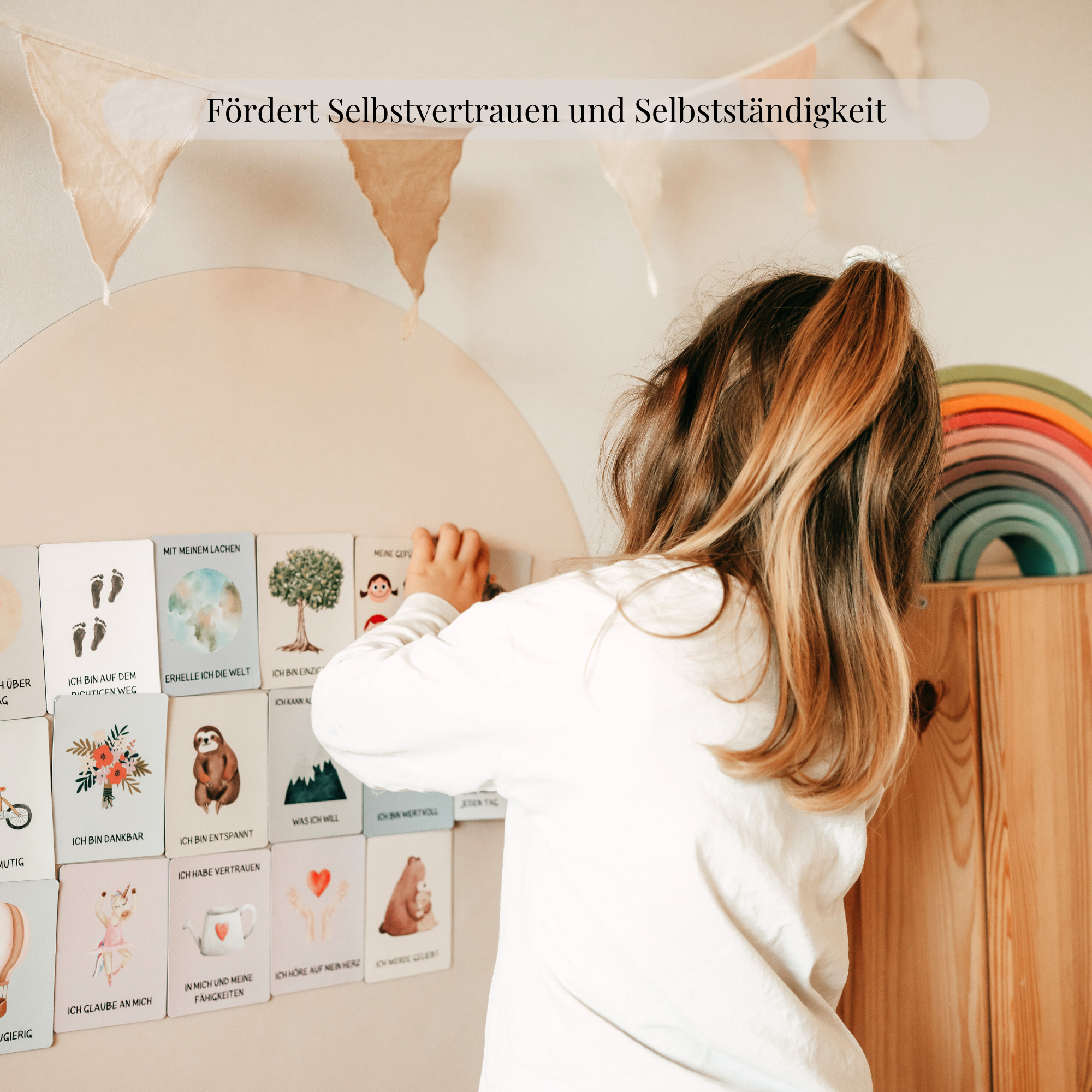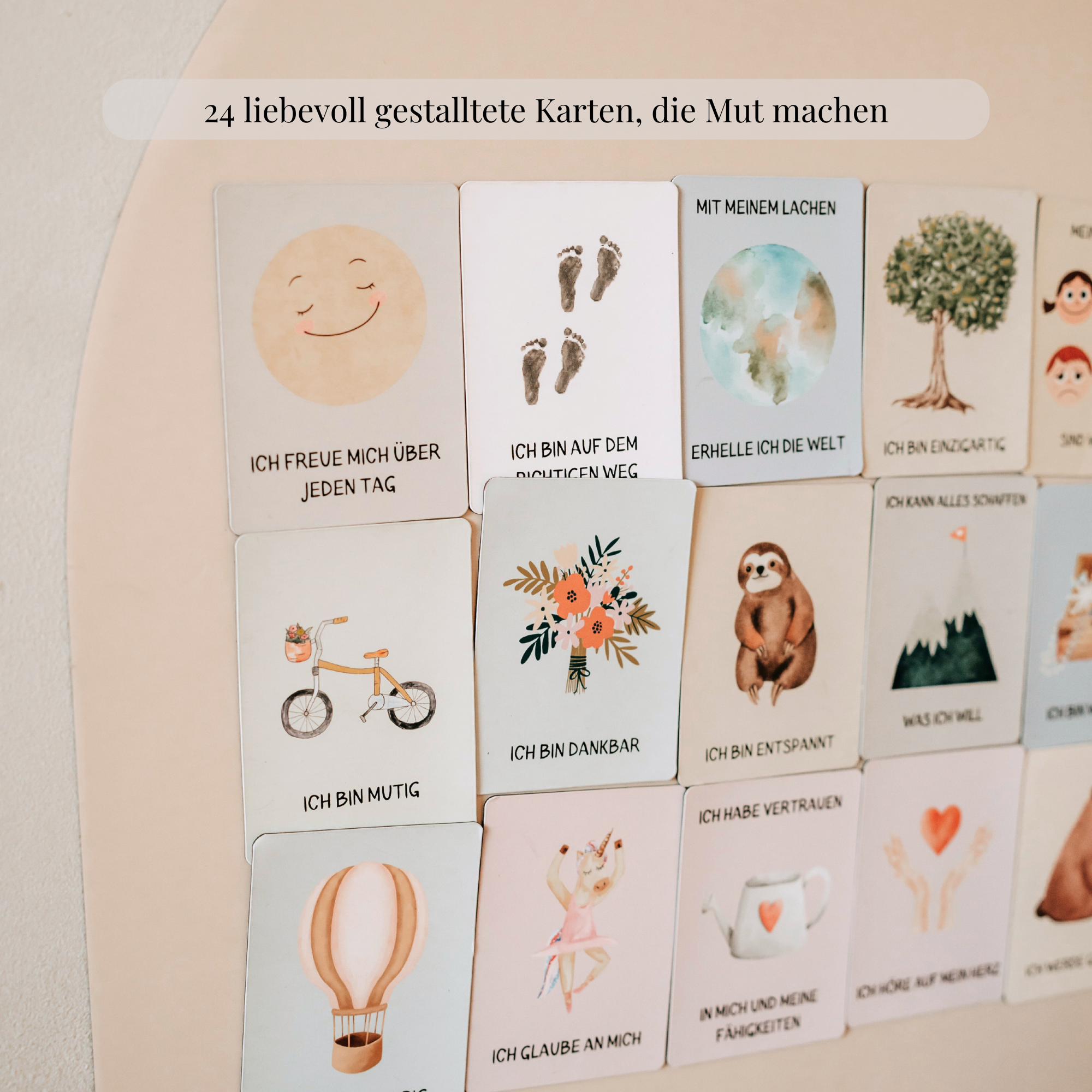 Das Set enthält 24 liebevoll gestaltete, magnetische Affirmationskarten, die dein Kind im Alltag und stärken und ihm auf spielerische Weise Selbstvertrauen schenken. Mit positiven, einfachen und kindgerechten Affirmationen helfen sie dabei, Gefühle wahrzunehmen, Mut zu entwickeln und an sich selbst zu glauben.